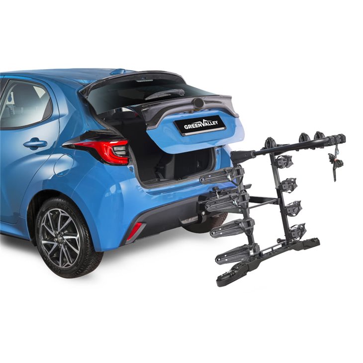 Portabicicletas plegable y abatible para bola de remolque. Capacidad para 4 bicicletas o 2 e-bikes hasta 60 Kg. Instalación rápida, acceso al maletero sin desmontarlo y antirrobo integrado.
